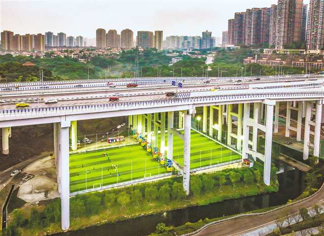 11月3日,九龍坡區五臺山足球公園,足球愛好者在橋下的球場內運動。 據悉,該項目由7萬平方米閑置土地治理改造而來,是集生態修復、運動休閑于一體的綜合性體育公園,配備了足球場、羽毛球+籃球館、兒童活動區等體育設施,以及253個生態停車位,并建設登山步道串聯山體綠道系統?!?/p>