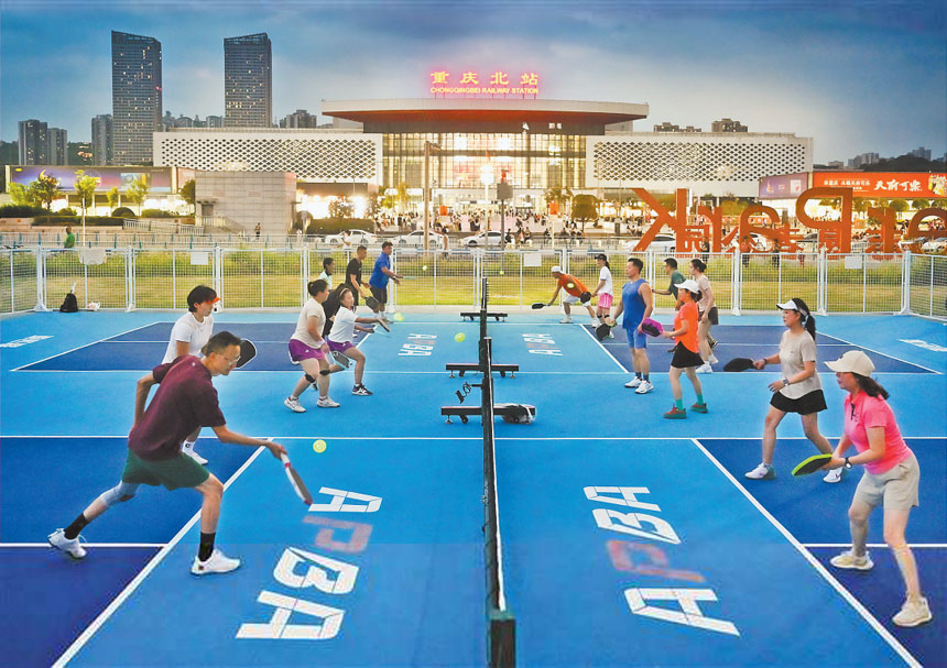 8月29日,重慶兩江新區天宮殿街道,市民打夜光匹克球鍛煉身體。 當日,重慶兩江新區天宮殿街道志愿者公園的匹克球場地正式免費向市民開放?!?/p>