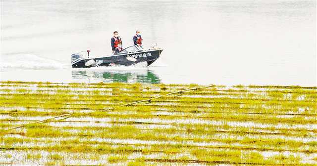 四月一日,在江津區鼎鍋浩魚類產卵場建的人工魚巢,護漁志愿隊正在進行巡護。記者 張錦輝 攝