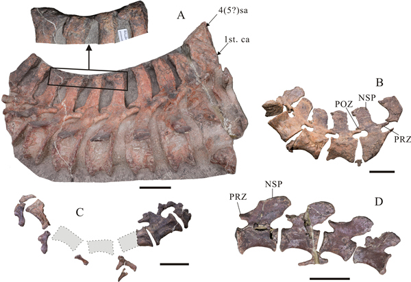 普賢峨眉龍的尾椎序列:前部尾椎(a)中部尾椎(b、c)后部尾椎(d)。重慶市規劃和自然資源局供圖