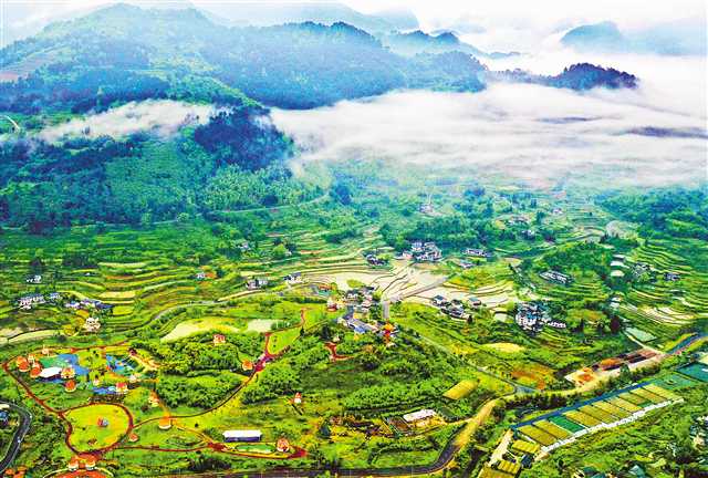 4月21日,萬盛叢林鎮晨霧繚繞,鄉村綠意盎然,景色美不勝收。近年來,萬盛加快采煤沉陷區生態環境修復,通過規模植綠行動和礦山地質環境治理以及水資源恢復、土地整治等,讓青山綠水重回山鄉。特約攝影 曹永龍