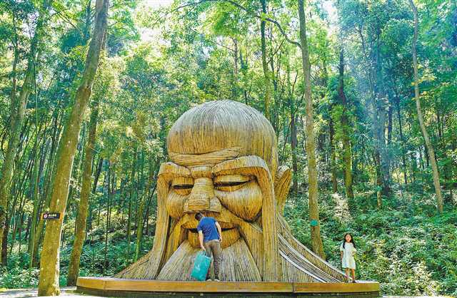 5月3日,在百里竹海景區,游客在壽竹制成的壽星塑像前游玩。 新華社記者 劉潺 攝