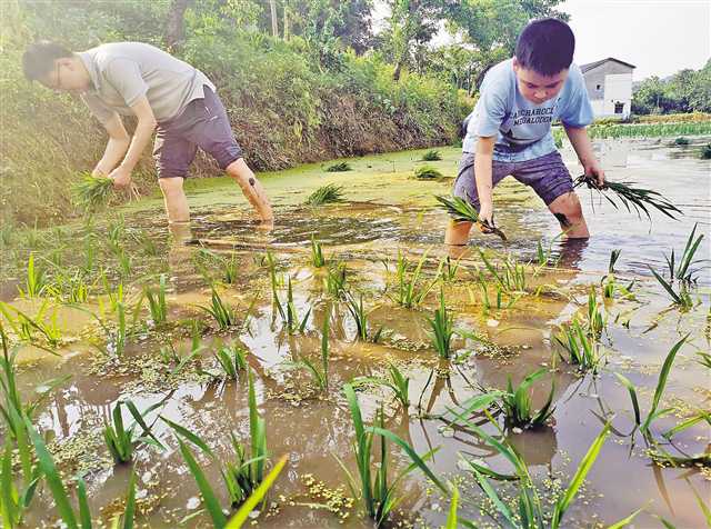 5月4日,綦江區永城鎮大橋村,來自城里的小朋友在家長帶領下學習插秧。通訊員 夏昌銘 攝