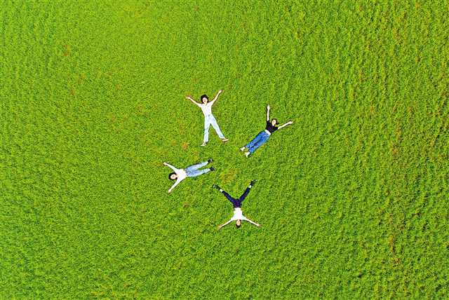 5月3日早上,巴南區木洞鎮中壩島上,幾位市民躺在青草叢中曬太陽、聞草香。這片草原面積達1000多畝,“五一”假期吸引不少市民乘船上島。特約攝影 鐘志兵