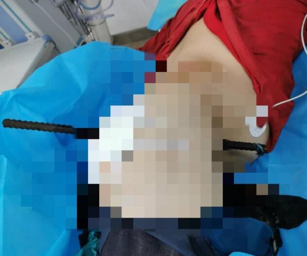 到達醫院后,消防員們被醫院工作人員帶到手術室外,按要求換好衣服后進入手術室,“當時看見一名男子側躺在手術臺上,一根鋼筋從臀部穿過男子身體! 天文特勤站隊長助理耿家家說,據他目測,臀部那一側鋼筋裸露在外有20厘米長,另一側裸露在外10厘米左右,鋼筋直徑在1.5厘米左右。后經測量,鋼筋長度在45厘米左右。