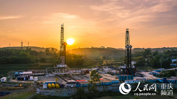 中國石化江漢油田涪陵頁巖氣田焦頁10號平臺,雙鉆機沐浴在初升的陽光下,正開足馬力向地層深處鉆進。向陽 攝