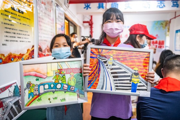 圖說:學生們用畫筆畫出的重慶軌道交通建設者。鄒樂攝