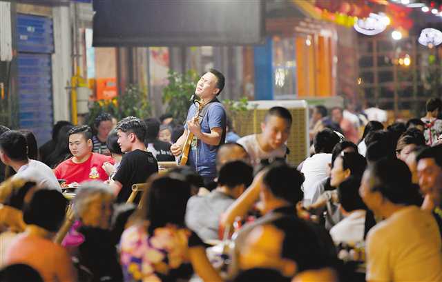 5月31日,九濱路外灘廣場,在消費夜排檔的人群中,一名街頭歌手正在深情演繹。