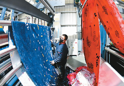 江蘇省連云港市金融機構日前對認定的142家疫情防控重點保障企業加大對接服務力度,落實優惠信貸資金23.29億元,建立貸款發放綠色通道,優先保障企業融資需求,助力企業加快復工生產。圖為在連云港海州經濟開發區,工人正在加工生產一批出口毛毯。