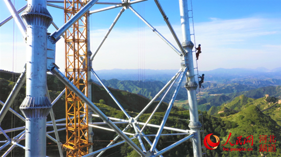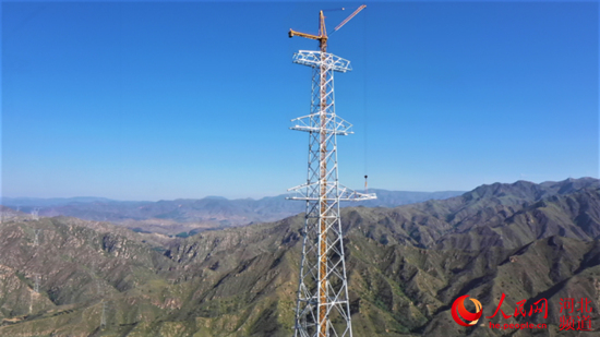 6月4日上午12時許,河北省保定市白石山烏龍溝長城西側,張北至雄安1000千伏特高壓交流輸變電工程線路工程(河北段)4S004組塔現場,隨著右側地線支架吊裝就位,標志著4S004鐵塔組立完成。