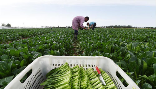6月8日,粵港澳大灣區“菜籃子”(金昌)生產基地工作人員在采摘蔬菜。 盛夏漸近,位于甘肅省金昌市金川區的粵港澳大灣區“菜籃子”(金昌)生產基地的多種蔬菜陸續豐收。該基地種植面積達1.3萬多畝,采用高效噴灌、精量播種等技術,以及“企業+合作社+基地+農戶”的模式,通過輪作倒茬、循環供應的方式,每年可種植蔬菜3至4茬,畝均產量2000公斤左右,總產值達1.5億元。 新華社記者 范培珅 攝