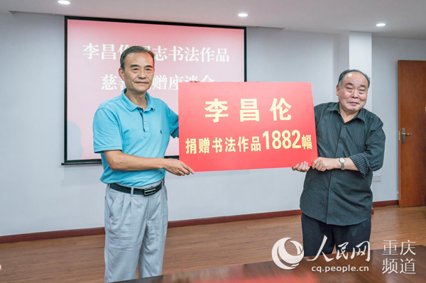 人民網重慶6月16日電(胡虹)6月15日、 70歲愛心書法家李昌倫將一生積攢的1882件自創作品(其中已裝裱70幅,未裝裱1812幅),全部無償捐贈給重慶市慈善總會,用于社會慈善事業。