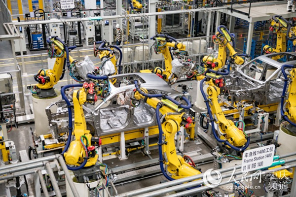 金康賽力斯兩江智能工廠,智能機器人在生產汽車。鄒樂攝