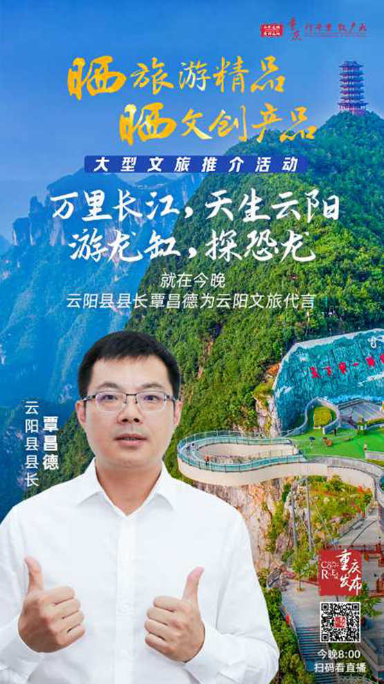 “云陽天生麗質,既有顏值又有氣質,不管是天下龍缸還是千年張飛廟,都是游客們來云必打卡之處。在端午晚的直播中,覃縣長將通過VCR等形式,向全國網友展現云陽幾大核心景區的優美風光和人文景觀。龍缸景區新開放的云端系列項目,也將在這次直播中與大家集體見面?傊,我們會將‘長江三峽最后的香格里拉’最精彩的景色一并呈上,供市民游客了解選擇,大美云陽,‘游’你做主!”該負責人介紹說。
