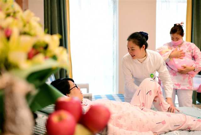 重慶市璧山區人民醫院婦產科病房內,護士正在為產婦做產后護理。攝/胡悅建