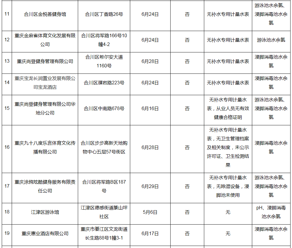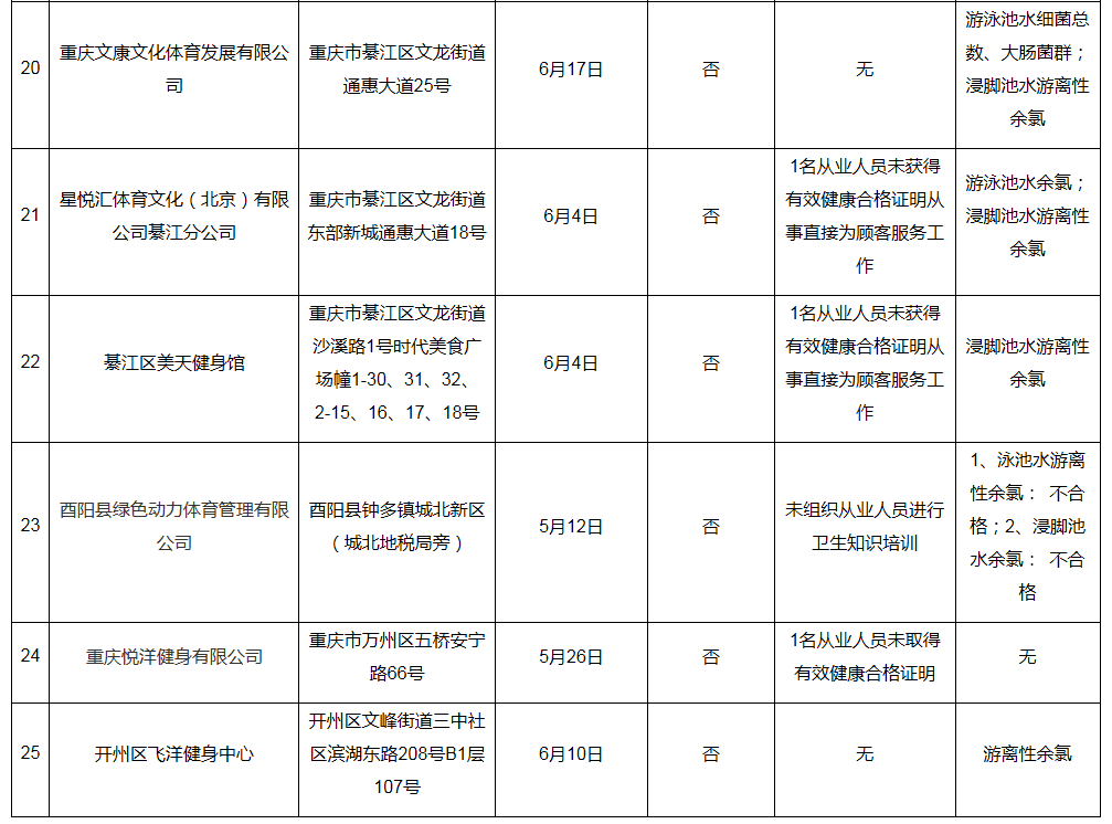 其中,位于渝中區凱旋路的重慶授裕智體育發展有限公司游泳池菌落總數檢測不合格;位于北碚區的重慶眾游體育文化傳播有限公司游泳池未配備水質檢測(余氯、PH)設備。監督檢查發現,位于綦江區的美天健身館游泳池浸腳池水游離性余氯檢測不合格,且1名直接為顧客服務的從業人員未獲得有效健康合格證明。