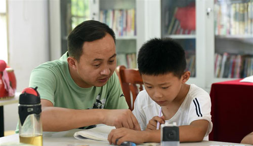 7月22日,在樅陽縣橫埠鎮方正小學安置點“愛心教室”里,方正小學老師操磊(左)指導小朋友寫暑假作業。