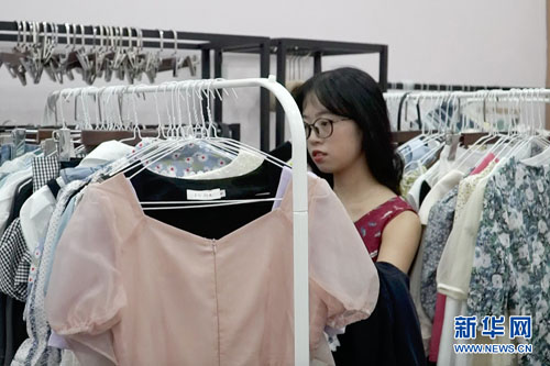 永川區聚麗電子商務有限公司的工作人員在整理設計的女裝產品。新華網 耿駿宇 攝