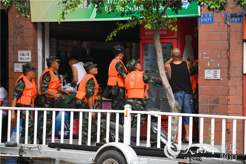 18日上午9時,巴南區魚洞下河碼頭水位達到189米,超警戒水位4米,造成部分商鋪被淹和交通中斷,嚴重威脅人民群眾生命財產安全。武警重慶總隊執勤第一支隊出動15名兵力,穿戴救生衣、佩戴口罩,攜帶鐵鏟、鋤頭、掃把等便攜工具,第一時間到達受災區域全力抗洪救災,先后轉移群眾300人、搶運物資16噸。