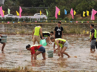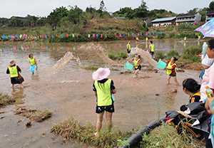 據了解,摸魚稻田水深60公分。數千條草魚、鯽魚等在田間穿梭,不少選手追逐著魚兒四處游動,引得魚兒躍出水面,F場吶喊助威聲不絕于耳,場面甚是壯觀。