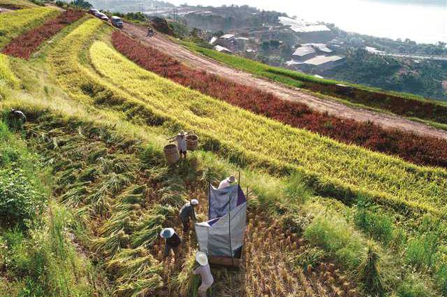 8月28日,大渡口跳磴鎮石盤村彩色稻田,村民在田間收割稻谷。龍在全 攝