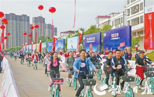 ▲許多市民朋友騎著共享單車參加歡樂騎行活動。韶關日報記者張偉攝