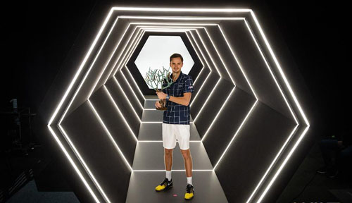 11月8日,梅德韋杰夫在頒獎儀式上。 當日,在2020巴黎網球大師賽單打決賽中,俄羅斯選手梅德韋杰夫以2比1戰勝德國選手茲維列夫,獲得冠軍。 新華社發(奧雷利安·莫里薩爾攝)