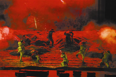 演出中,設計巧妙的舞美道具,融合爆破、多媒體、具有雕塑感的服裝造型,逼真的戰場音效和觸動心靈的音樂,贏得了觀眾“出乎意料、大片體驗”的贊譽。對此,導演李任表示:“我們的定位是在舞臺上做前所未有的舞臺奇觀,包括戰爭中真實的爆破、槍的掃射,以及手榴彈把人炸飛的特效。我們請到《八佰》同時也是《金剛川》的特效團隊,幫我們做研發。這是一個非常專業的團隊,最終讓這部劇呈現出了非常好的視覺效果!
