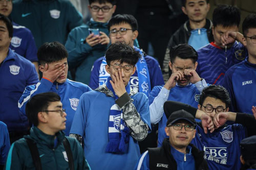 11月11日,現場觀戰的石家莊永昌隊球迷在球隊降級后落淚。