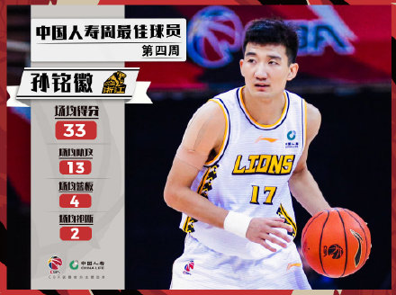 孫銘徽在第四周的兩場比賽中,場均出戰45.2分鐘,貢獻了33分、13次助攻、4個籃板以及2次搶斷的全面數據,真實命中率高達67.6%,廣廈隊取得了一勝一負戰績。此外,憑借出色的個人表現,他還榮獲第一階段的本土球員得分王與助攻王。