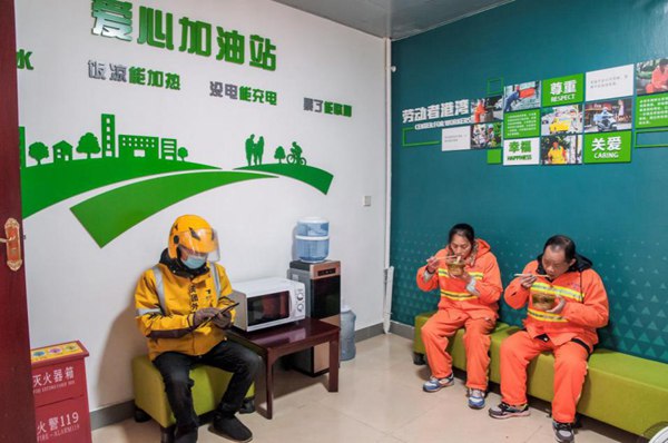 外賣小哥和環衛工人在“勞動者港灣”休息用餐。 重慶市城市管理局供圖