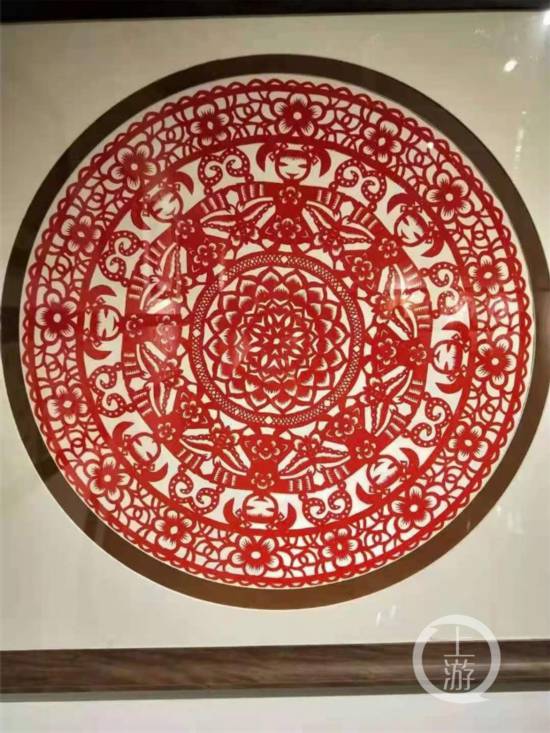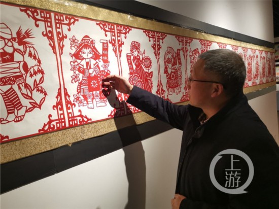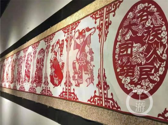 走進巫溪縣博物館一樓的展覽廳,一張長24米的紅色鏤空巨幅剪紙顯現在眼前,這便是曾德元的得意作品《各民族大團結》。