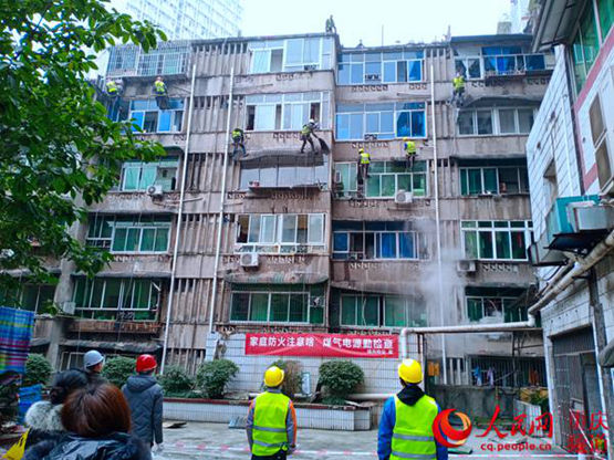 人民網重慶1月27日電 “為了您的安全請不要靠近現場,這里正在進行可燃雨棚拆除!苯,在沙坪壩區天星橋街道柑子村社區部分老舊小區,不少工人對居民樓可燃雨棚進行拆除。