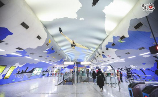烈士墓站大廳,高大的穹頂用簡潔的涂鴉呈現出了藍天白云與翱翔的雄鷹,套色木刻畫種和傳統皮影戲手法,并結合中國的白描技藝,展示了對和諧幸福生活的向往。