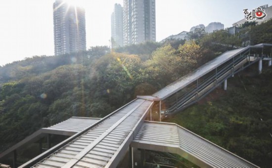 【立體】——單軌3號線唐家院子站2號出口,從這里可以“爬山”到頂部直達黃泥塝附近。不想“爬山”的乘客也不用擔心,這里還安裝了2條扶梯,方便市民出行。