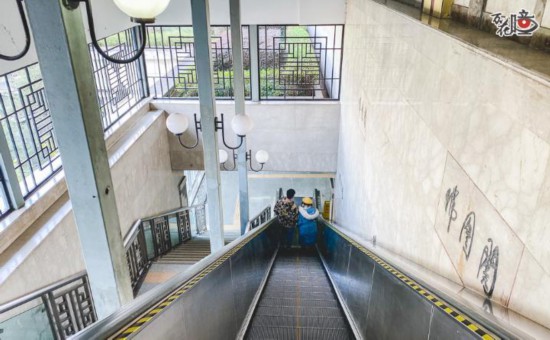進入佛圖關站站臺扶梯,圓形的壁燈、回紋設計的窗框與欄桿、石材雕刻的墻面,無一不凸顯著古香古色的中國風。