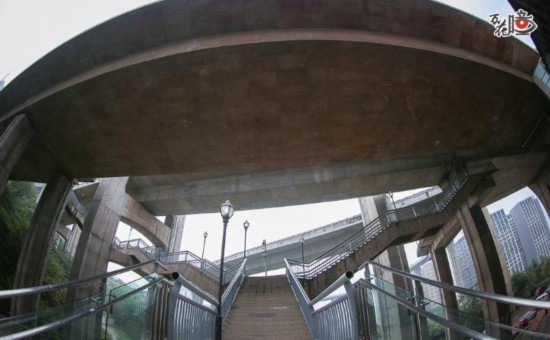 【融合】——單軌3號線銅元局站,走出車站,便是眼前蜿蜒崎嶇的樓梯和高大盤旋的“網紅”蘇家壩立交橋。軌道交通、千層梯、大橋三者結合,加之全景反光玻璃倒影折板樓梯,將縱橫交錯的懸空梯道映入鏡內,呈現一個“Y”字高架橋的獨特景觀,也成為了《火鍋英雄》《從你的全世界路過》《少年的你》等影視作品的取景地。
