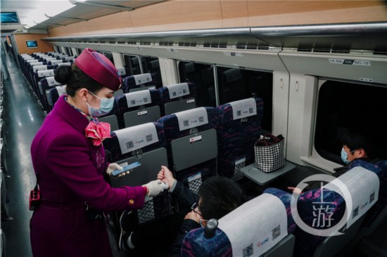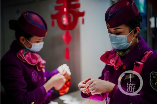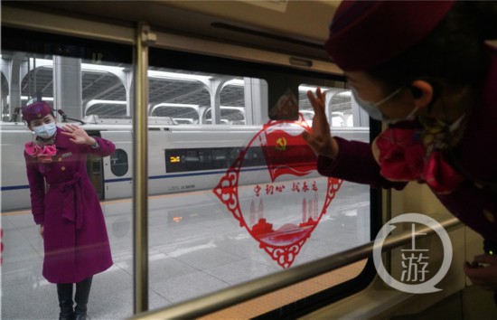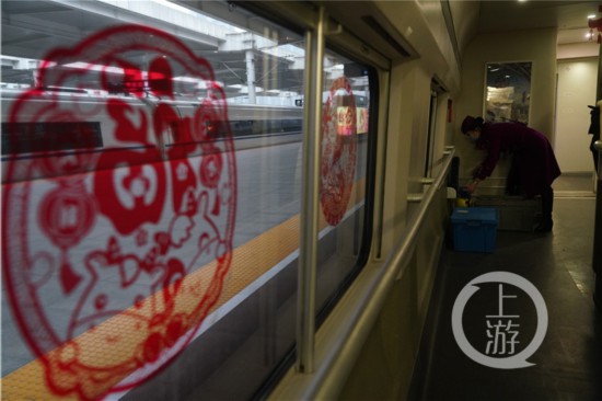 妹妹給姐姐送完好吃的,姐妹倆一起在動車窗戶上貼上喜慶的窗花,為旅途增添節日的喜慶和氛圍,讓旅客在車上就能感受到春節的氣息。