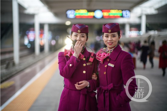 李春燕(左)和李紅燕兩位雙胞胎姐妹花是成都局集團有限公司重慶客運段的新晉動車列車長。