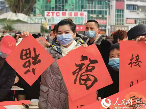 人民網重慶2月4日電 近日,重慶市榮昌區新時代文明實踐中心“小院講堂”志愿者,“義務寫春聯”等便民志愿服務走進榮昌人氣最旺的老商圈--黃桷樹購物廣場,志愿者們現場提供的免費擦鞋、講解衣物收納整理知識、寫春聯等一系列豐富多彩的活動,讓年味十足。
