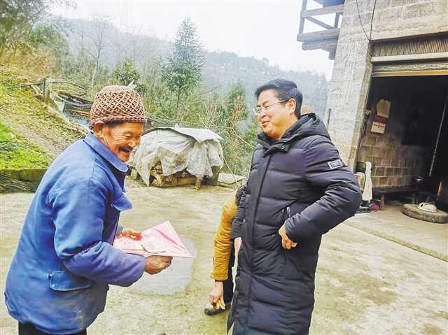 郭守順(右)到村民家走訪并送上春聯。(受訪者供圖)