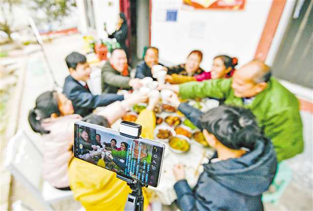 2月8日,榮昌區銅鼓鎮高山村,脫貧戶劉佰菊一家正吃著團年飯。與往年不同,今年農村電商平臺對其團年飯進行了網絡直播,讓廣大網友一起感受脫貧戶的新年喜悅。記者 齊嵐森 攝/視覺重慶