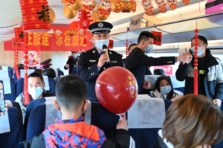 2月9日,C6409次列車上乘車旅客與演員合影。包亮攝
