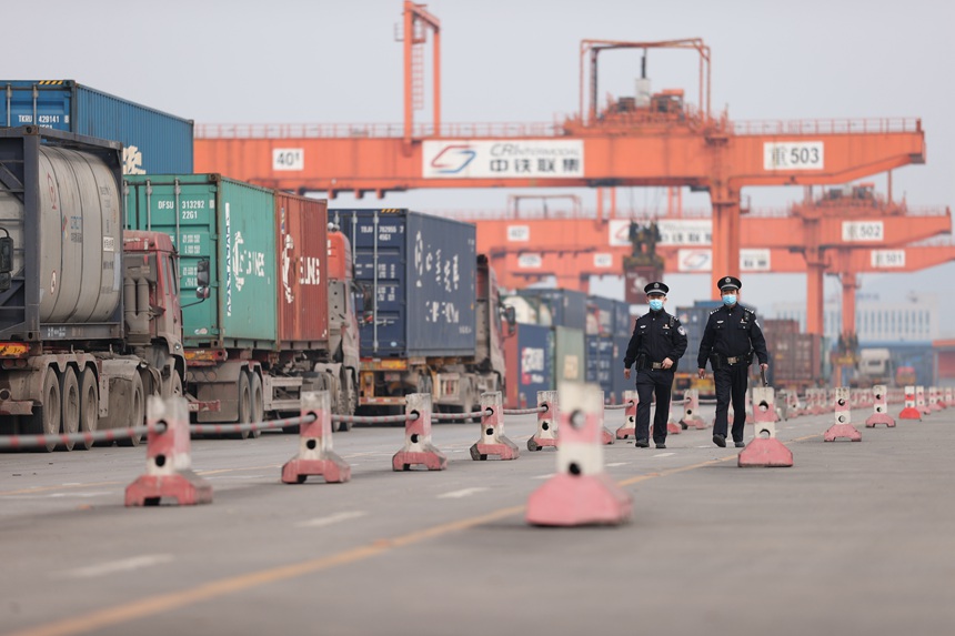 民警雷激(右)和同事對進出中心站集裝箱裝載區貨車進行巡查。胡勇攝