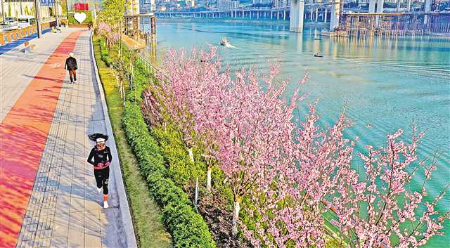 2月19日,北濱路,紅梅花兒扮靚濱江健身步道。特約攝影 鐘志兵/視覺重慶