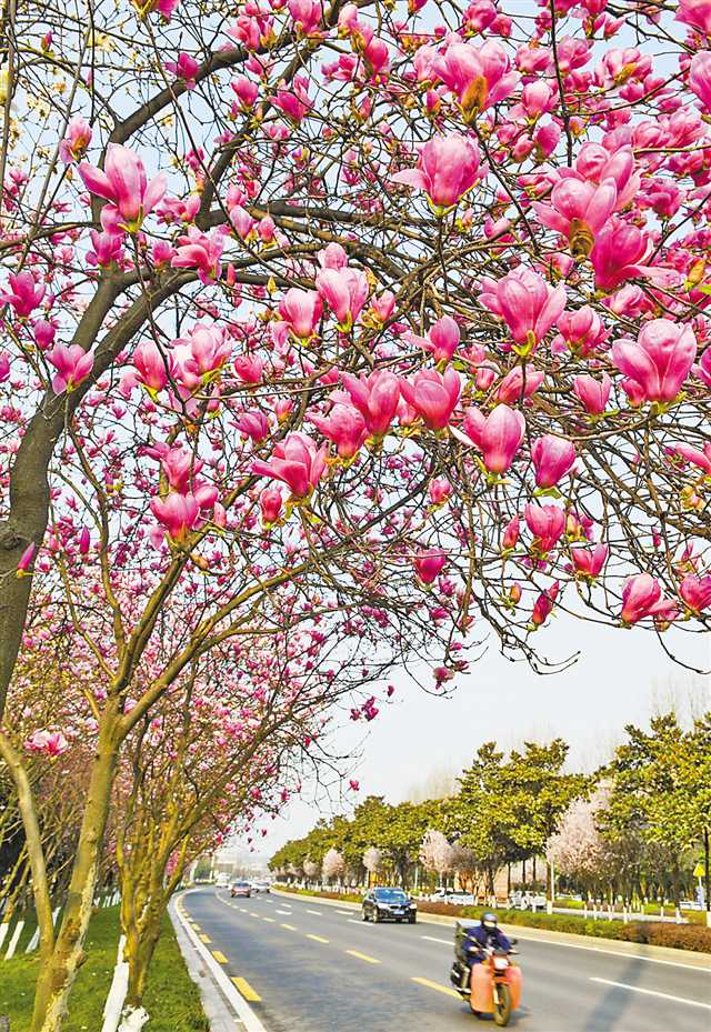 2月23日,在兩江新區金山大道,車輛從盛開的玉蘭花下駛過。記者 張錦輝 攝/視覺重慶