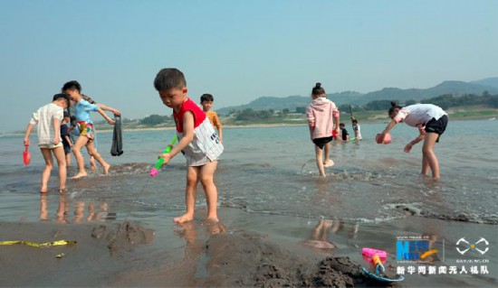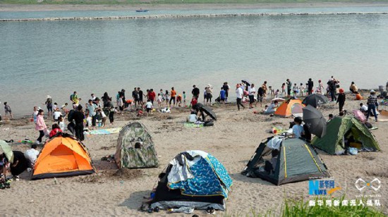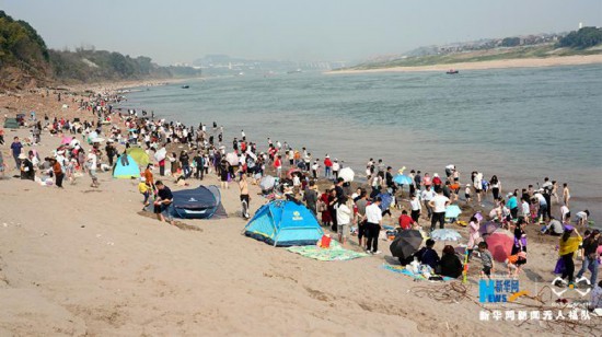 游客在牛欄壩江邊沙灘享受別樣風情。新華網 馬天龍 攝