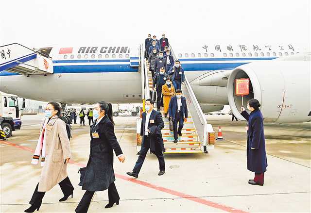 三月三日,在渝全國人大代表和住渝全國政協委員分別乘機抵達北京,正式進入“兩會時間”。代表委員們將聚焦高質量發展、成渝地區雙城經濟圈建設、鄉村振興、民生實事等,積極建言獻策。圖為出席十三屆全國人大四次會議的重慶代表團抵達北京。