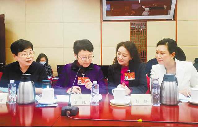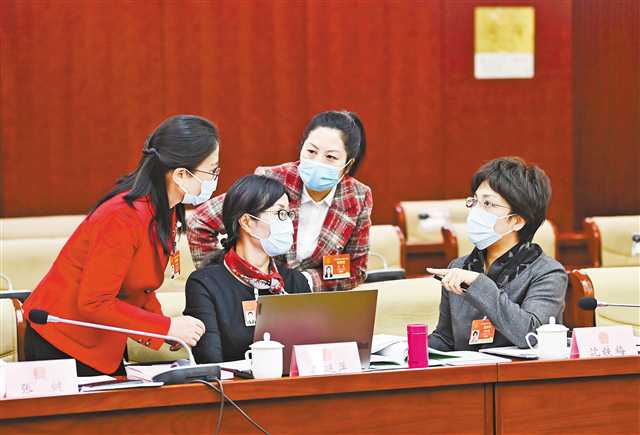 全國政協委員、重慶靜昇律師事務所主任律師彭靜(右二)與婦聯界別委員一起討論提案。(市政協辦公廳供圖)