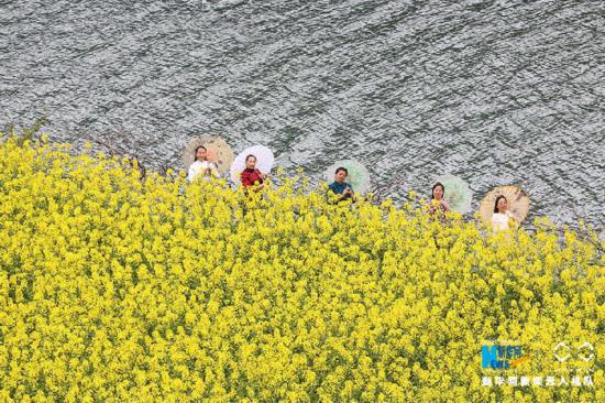 游客在阿蓬江畔的油菜花田里游玩。新華網發(楊敏 攝)